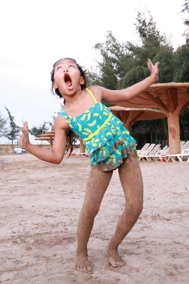 Trong khi bố mẹ chụp ảnh lãng mạn, tình tứ bên bờ biển thì bé Elyza Phương Vy lại hào hứng nghịch cát và tạo dáng “bá đạo” trước ống kính.