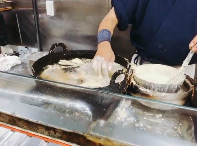 Đoạn video do nickname Yuku1991 đăng trên Twitter hôm 15/8 cho thấy đầu bếp này lấy lòng đỏ trứng từ một cái bát và nhúng vào một bát bột tempura. Sau đó, nam đầu bếp cho phần bột trứng vào chảo dầu ăn đang sôi sùng sục, nhúng cả những ngón tay không có bất kỳ đồ dùng bảo hộ nào vào dầu.