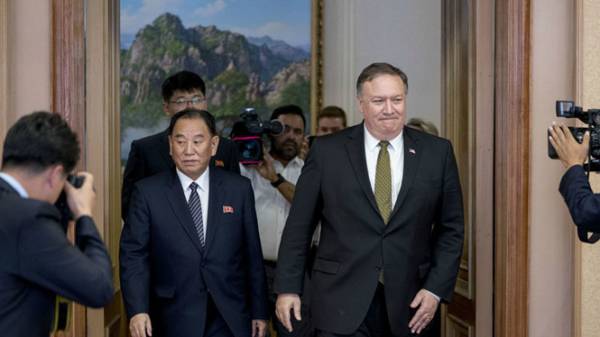 Ông Kim Yong-chol (trái) và Mike Pompeo tại Bình Nhưỡng hồi tháng 7
