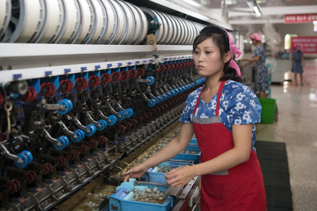Một phụ nữ làm việc trong nhà máy dệt lụa Kim Jong Suk Silk ở thành phố B́nh Nhưỡng.
