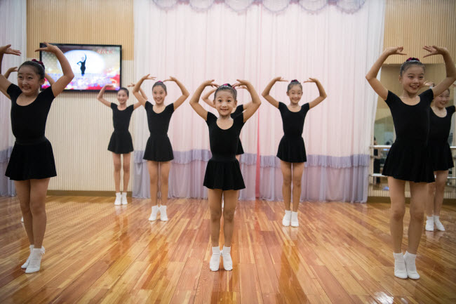 Các bé gái luyện tập múa ba lê tại Cung thiếu nhi Mansyongdae ở B́nh Nhưỡng.