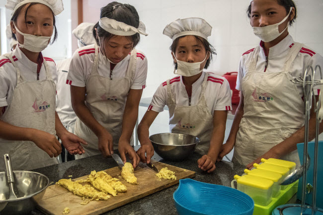 Trẻ em tham gia lớp học nấu ăn tại Trại hè thiếu nhi quốc tế Songdowon ở thành phố Wonsan.