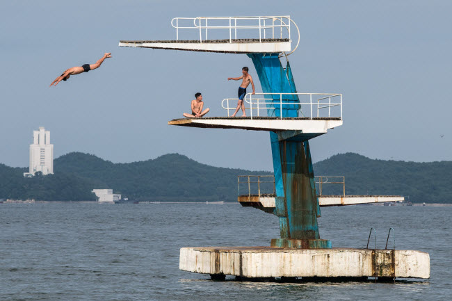 Những người đàn ông Triều Tiên nhảy cầu tắm mát trong một hồ lớn.