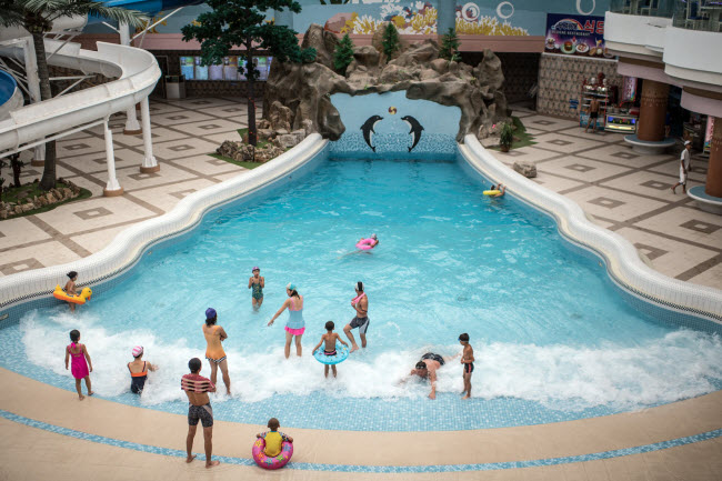 Chơi đùa trong bể bơi tạo sóng tại công viên nước Munsu ở B́nh Nhưỡng.