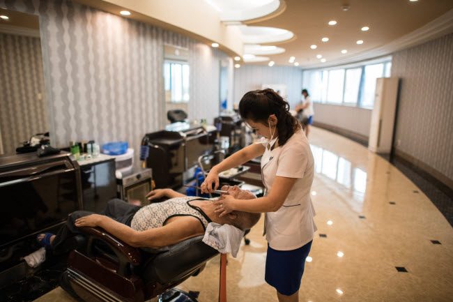 Nhân viên hiệu cách tóc cạo râu cho khách tại tổ hợp công viên nước Munsu ở thành phố B́nh Nhưỡng.