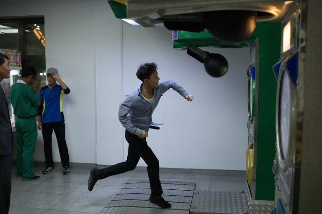 Chàng thanh niên thử sức mạnh với một tṛ chơi trong công viên thanh niên Kaeson ở B́nh Nhưỡng.