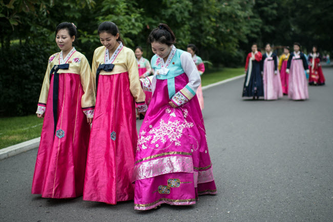 Những phụ nữ Triều Tiên mặc trang phục truyền thống khi tham dự một sự kiện ở thành phố B́nh Nhưỡng.