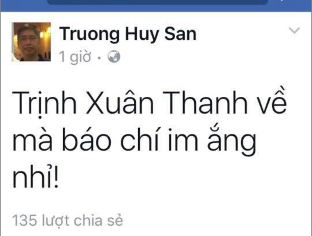 Nhà báo Trương Huy San (Osin Huy Đức) hôm 30.7.2017 đã đăng tải dòng trạng thái: “Trịnh Xuân Thanh về mà báo chí im ắng nhỉ!”.