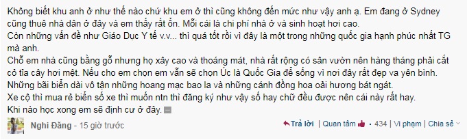 Phản bác lại ý kiến này, độc giả Nghi Đăng bình luận: “Chỗ em nhà cũng bằng gỗ nhưng họ xây cao và thoáng mát, nhà rất rộng có sân vườn nên hàng tháng phải cắt cỏ tỉa cây hơi mệt. Nếu cho em chọn em vẫn sẽ chọn Úc là quốc gia để sống vì nơi đây rất đẹp và yên bình. Những bãi biển dài vô tận những hoang mạc bao la và những cánh đồng hoa oải hương bát ngát. Xe cộ thì mua rẻ, biển số xe thì muốn như thế nào thì đăng ký như vậy số hay chữ đều được nên cái này rất hay. Khi nào học xong em sẽ định cư ở đây”.