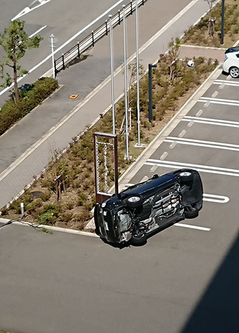 Một chiếc xe bị lật nằm trên đường đi làm của Nguyễn Hà. Đường sá đã được dọn dẹp sạch sẽ sau khi bão đi qua. Ảnh: Nguyễn Hà