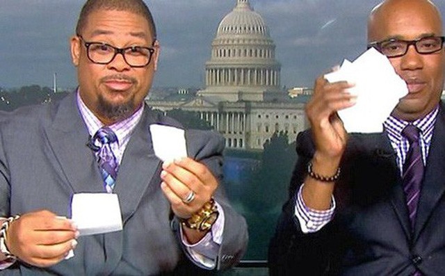 Hai ông Reginald Young Jr. (trái) và Solomon Lartey diễn tả lại công việc dán giấy tờ, tài liệu bị Tổng thống Donald Trump xé rách khi trả lời phỏng vấn đài CNN Ảnh: CNN