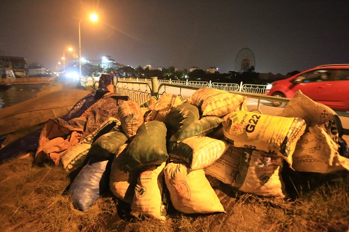 Khoảng 21h30 ngày 13/9, tại khu vực đường Nhật Chiêu thuộc phường Quảng An (Tây Hồ, Hà Nội), ba công nhân vẫn đang mải miết gom gần hai tấn cá chết vào các bao tải. “Cá chết xuất hiện từ sáng nay, theo gió trôi dạt về khu vực này. Hiện, chúng tôi đã gom được gần 2 tấn, ở hồ vẫn còn rất nhiều", một công nhân cho biết.