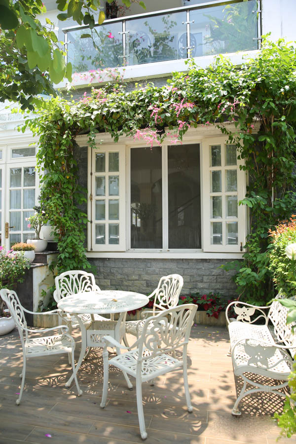 Phần sân trước nhà được kê bộ bàn ghế để buổi chiều các thành viên trong gia đình ngồi hóng mát, trò chuyện cùng nhau.