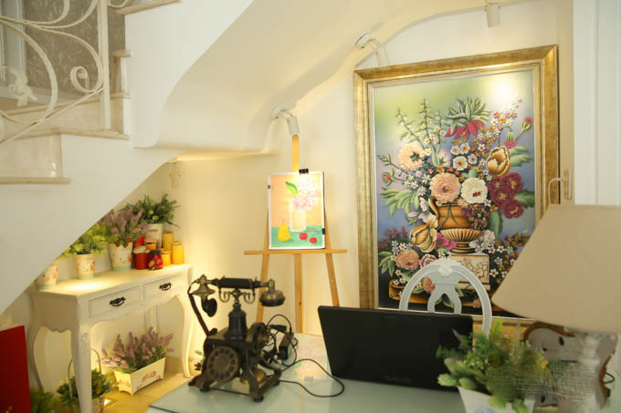 Góc dưới cầu thang được tận dụng đặt bàn làm việc và giá vẽ. Trước khi chuyển sang sáng tác nhạc, Minh Khang từng là một họa sĩ. Thỉnh thoảng anh vẫn dạy hai con gái vẽ tranh.