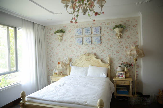 Tầng một là phòng ngủ của hai cô con gái Suli và Suti. Thúy Hạnh kỳ công mua sắm tất cả vật dụng mang biểu tượng hoa hồng, tạo cảm giác căn phòng như dành cho các nàng công chúa trong cổ tích.