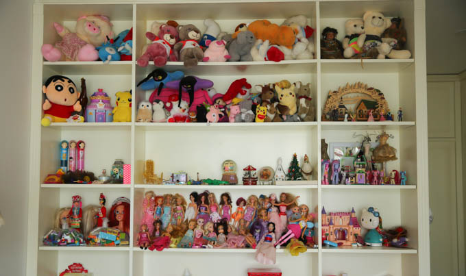Tủ đồ chơi của hai bé ngập tràn các loại búp bê, thú nhồi bông... nhưng được sắp xếp, phân loại ngăn nắp, gọn gàng. Thúy Hạnh nói chị rèn cho các con thói quen tự dọn dẹp phòng riêng từ nhỏ.