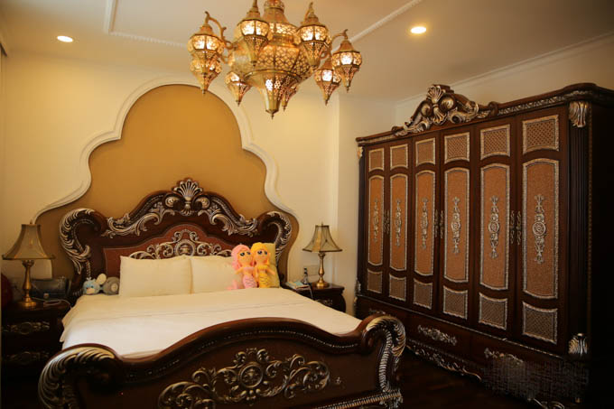 Tầng hai là phòng ngủ mang phong cách Ảrập huyền bí của vợ chồng Thúy Hạnh. Cựu người mẫu muốn mỗi khu vực trong nhà mang màu sắc khác nhau, tạo cảm giác mới mẻ, thú vị.