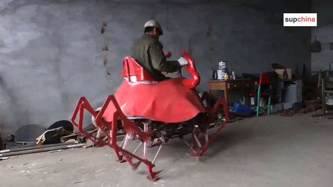Cỗ máy có 8 chân, cao chừng 1m, chiều dài, rộng khoảng 1,2m trong video là tác phẩm của một bác nông dân họ Phú ở Hắc Hà, tỉnh Hắc Long Giang. Nó có thể chở một người nặng không quá 100kg.
