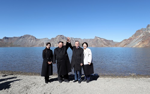 Sau hội nghị thượng đỉnh lần ba ở Bình Nhưỡng, Kim Jong-un và Moon Jae-in cùng các phu nhân và quan chức cấp cao hai nước sáng 20/9 đã lên thăm núi Paektu và hồ nước nổi tiếng ở miệng núi lửa Cheonji.