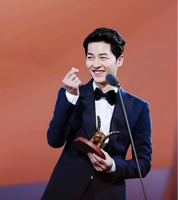 Diễn viên Hàn Quốc Song Joong-ki làm biểu tượng bắn tim tại một lễ trao giải năm 2016. Ảnh: Twitter.