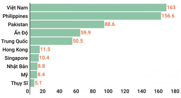 Cụ thể, người Philippines phải làm việc 156,6 ngày để có thể mua iPhone XS, Pakistan là 88,6 ngày, Ấn Độ là 59,9 ngày, Trung Quốc 50,4 ngày, Nga 48,2 ngày.