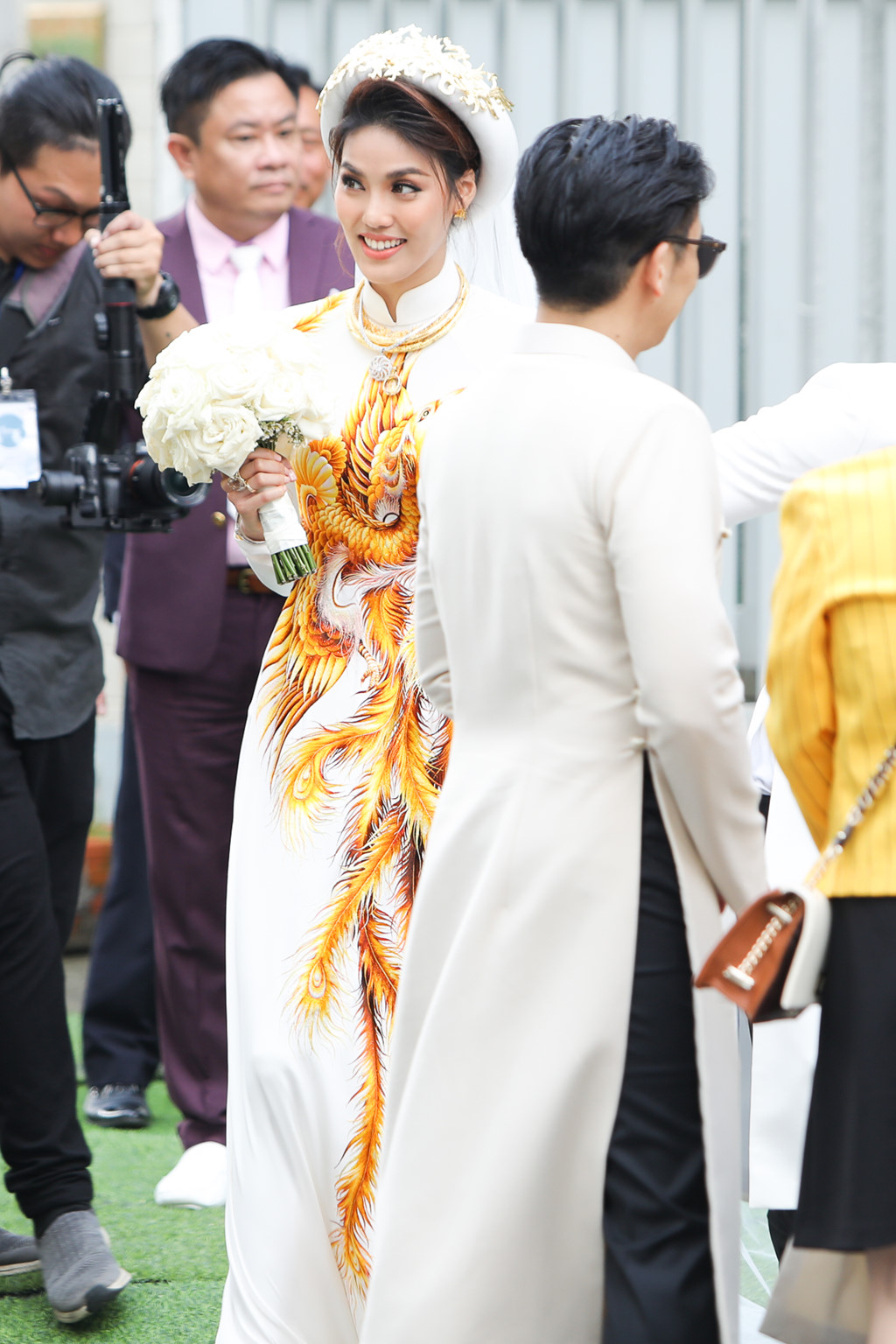 Cô dâu Lan Khuê mặc áo dài thêu họa tiết rồng vàng.