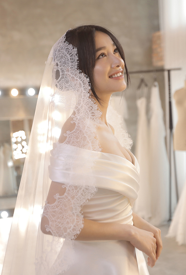 Khăn voan đi kèm bộ váy này đính ren ở đường diềm.