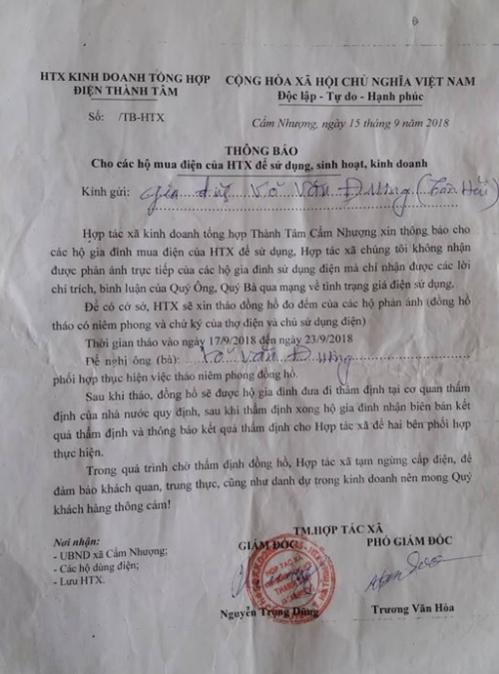 Theo chị Nguyễn Thị Hoa (SN 1982), trú tại xóm Tân Hải, xã Cẩm Nhượng, huyện Cẩm Xuyên, ngày 13/9, do bức xúc khi tiền điện 3 tháng của gia đình liên tiếp tăng bất thường, chị đã viết lên facebook cá nhân. Ngay sau đó, chị bất ngờ nhận được thông báo cắt điện của HTX Thành Tâm.