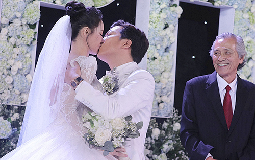 Cả hai dành cho nhau nụ hôn ngọt ngào trước sự chứng kiến của hai gia đình và khách mời.