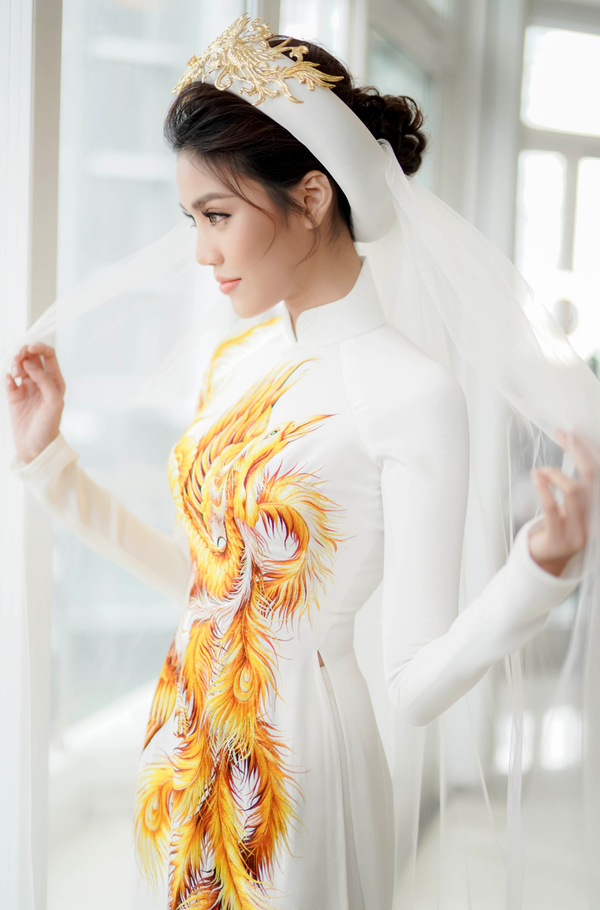 Lựa chọn áo dài truyền thống, vợ chồng Lan Khuê vẫn khiến nhiều người trầm trồ khi chiếc áo họ khoác lên người được thêu vàng, do nhà thiết kế nghiên cứu hình ảnh và thực hiện trong vòng ba tháng.