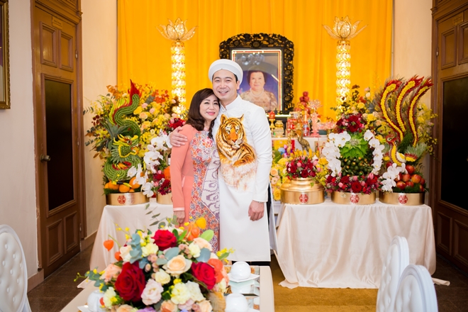 Vợ chồng Lan Khuê diện áo dài thêu chỉ vàng