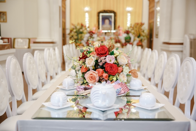 Trong khi đó, ở bên nhà chú rể, màu vàng mang màu sắc Phật giáo được chọn làm tông chủ đạo trên nền biệt thự kiểu châu Âu.