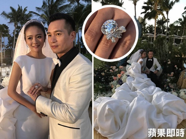 Trần Vinh Luyện đã dành tặng vợ bộ váy cưới bồng bềnh như đám mây trắng được An Dĩ Hiên đặt riêng từ thương hiệu Stéphane Rolland, giá khoảng 90.000 USD (hơn 2 tỷ đồng). Nhẫn cưới của An Dĩ Hiên cũng là nhẫn kim cương 10,57 carat.