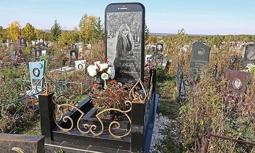 Chiếc bia mộ kể trên được làm mô phỏng theo hình chiếc điện thoại di động iPhone của Rita Shameeva thực sự khác biệt và nổi bật giữa nghĩa trang Yuzhnoye tại thành phố Ufa, theo Daily Star.