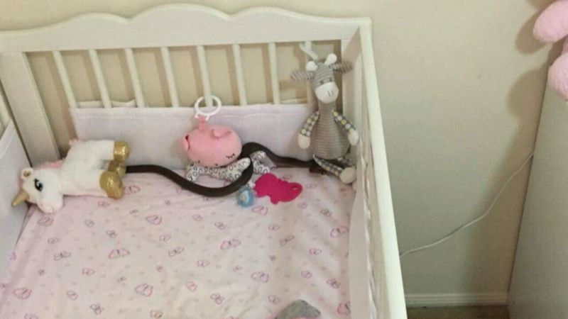 Một bà mẹ đã vô cùng hoảng sợ khi bắt gặp con rắn. Nó nằm trên nôi của bé gái 4 tháng tuổi. May mắn thay, cô bé mới tỉnh dậy và ra ngoài với mẹ cách đó không lâu.