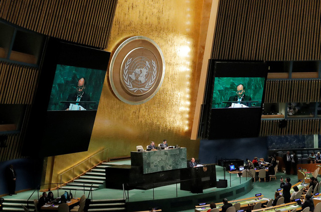 Thủ tướng Nguyễn Xuân Phúc phát biểu tại Đại hội đồng LHQ ở New York vào chiều ngày 27/9 theo giờ Mỹ (Ảnh: LHQ)