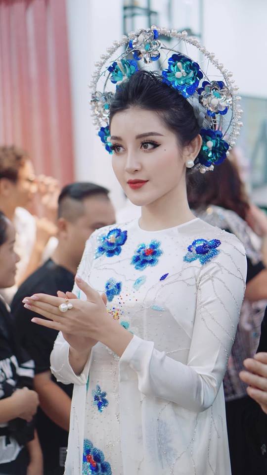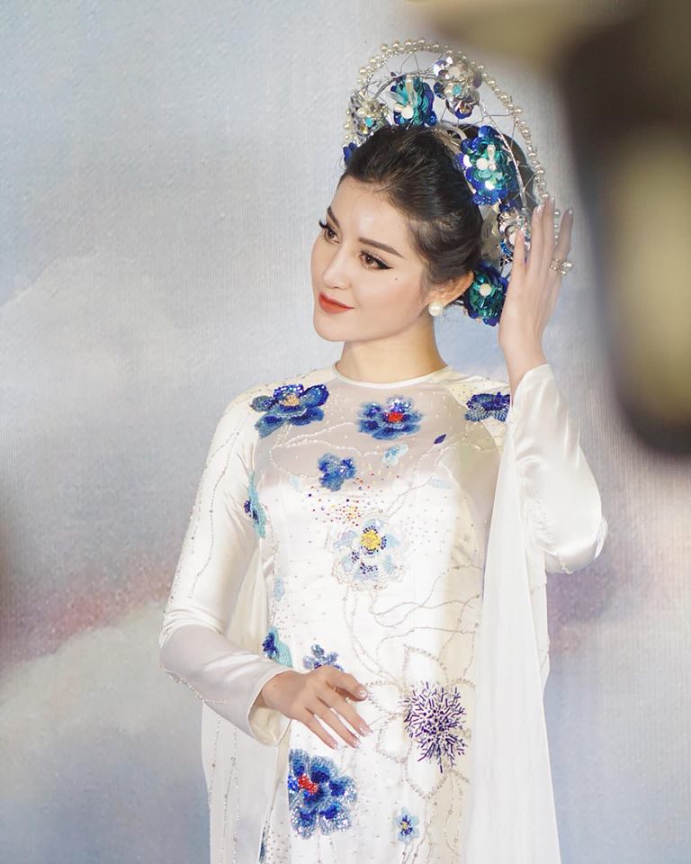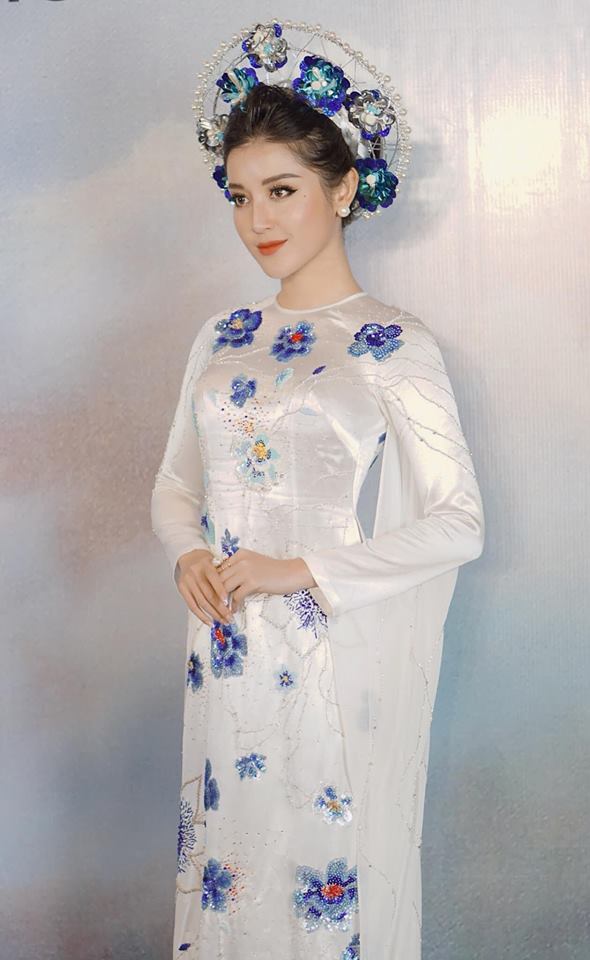 Trong hình ảnh này, đại diện Việt Nam tham gia Miss Grand International 2017 diện bộ áo dài trắng thướt tha được thiết kế tinh tế không kém phần gợi cảm.