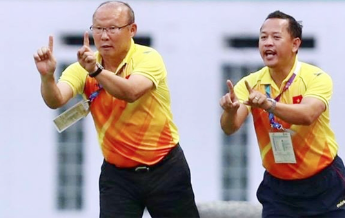 HLV Park Hang-seo (trái) và trợ lý Huy Khoa tại Asiad 2018 trên đất Indonesia. Ảnh: Đức Đồng.