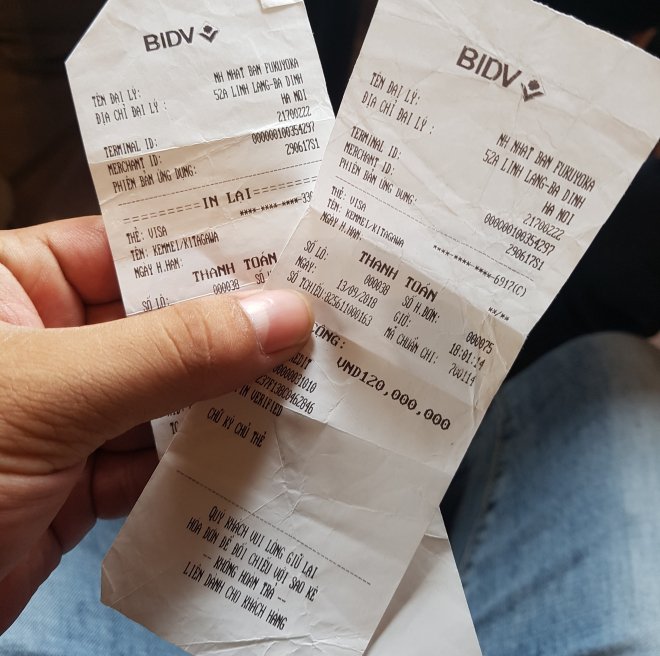 Hai hóa đơn mà ông Kitagawa Kemmei bị ép thanh toán bằng g thẻ Credit và thẻ Debit với số tiền 124,5 triệu đồng (thẻ Credit 120 triệu đồng, thẻ Debit 4,5 triệu đồng)