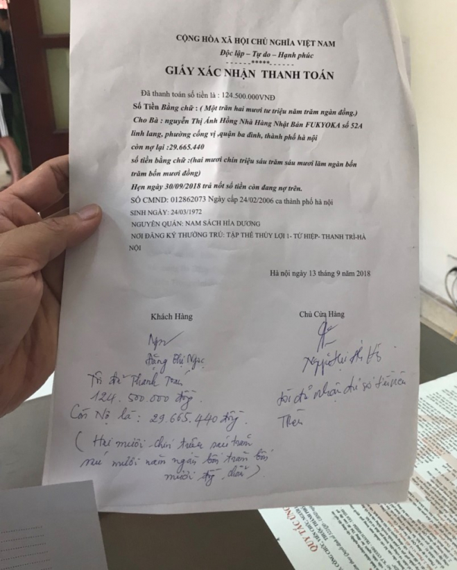 Sau khi hoàn tất thủ tục thanh toán hóa đơn, phía nhà hàng đã đưa cho bà Ngọc số tiền 114 triệu 540 nghìn đồng. Trong khi đó, ông Kitagawa Kemmei phải chịu phí 8% của việc nhờ nhà hàng lấy tiền mặt cho. Sau khi lấy được tiền từ nhà hàng, bà Ngọc có viết lại vài chữ trên biên bản xác nhận công nợ cho ông Kitagawa Kemmei là: “ngày 13/9/2018, ông Kitagawa đã gửi số tiền 114.540.000 đồng, tương đương 4.980 USD ( trong tổng số 23.000 đồng/USD của hợp đồng giao dịch kinh tế trước đó)”.