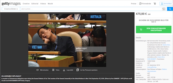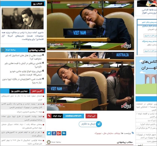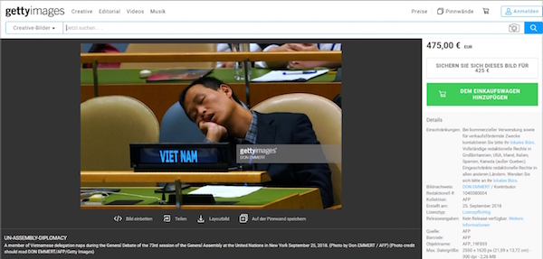 Kể cả bức ảnh „bên cạnh thành viên phái đoàn Việt Nam đang ngủ có một phụ nữ mang balo, khom lưng ngồi dùng điện thoại“ cũng được tác giả ghi chú là „một thành viên Phái đoàn Việt nam đang ngủ trong lúc họp Phiên thảo luận chung Đại hội đồng LHQ Khóa 73 tại New York ngày 25 tháng 9 năm 2018“ (A member of Vietnamese delegation naps during the General Debate of the 73rd session of the General Assembly at the United Nations in New York September 25, 2018).