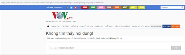 Báo điện tử của Đài Tiếng nói Việt Nam đã đăng bài viết này vào ngày 29/09/2018, nhưng chưa đầy 1 ngày sau đã cho gỡ bỏ bài báo này. Hiện nay trên Google vẫn còn dấu tích của nó.