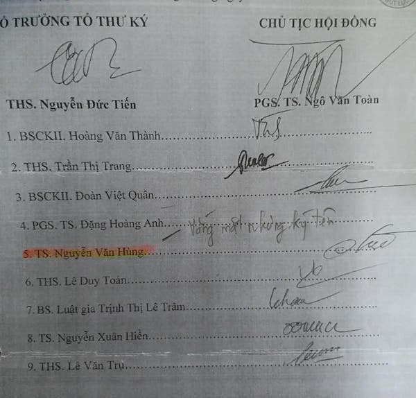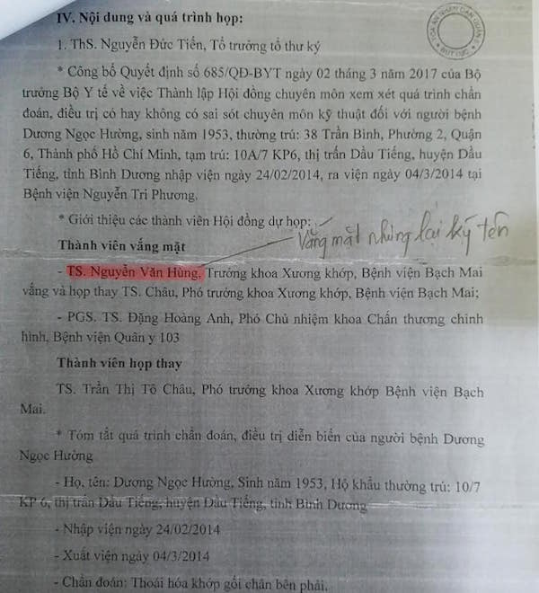 Thành phần họp Hội đồng chuyên môn ghi một Bác sĩ vắng mặt (không tham gia) nhưng phía cuối Bản Kết luận, Bác sĩ vắng mặt lại ký tên. Ngoài ra, khi họp không mời chị theo quy định của Luật Khám, Chữa bệnh.