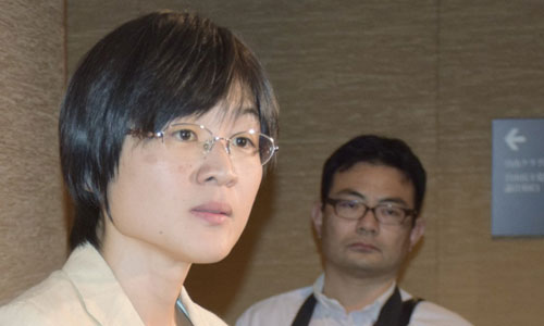 Bà Yuka Ogata (trái) trả lời phỏng vấn sau khi bị đuổi ra khỏi phòng họp. Ảnh: HuffingtonPost.