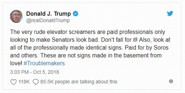 Một cuộc biểu tình lớn xảy ra tại Hoa Thịnh Đốn vào ngày hôm nay 5-10-2018. Ông Trump cho rằng tỷ phú gốc Do Thái - Hung Gia Lợi là người đứng đằng sau.