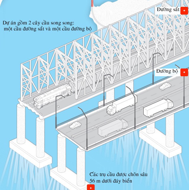 Cây cầu gồm phần đường sắt và phần đường bộ (Đồ họa: Rferl)