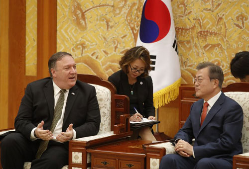 Pompeo (trái) trao đổi với Tổng thống Hàn Quốc Moon Jae-in hôm nay. Ảnh: AFP.