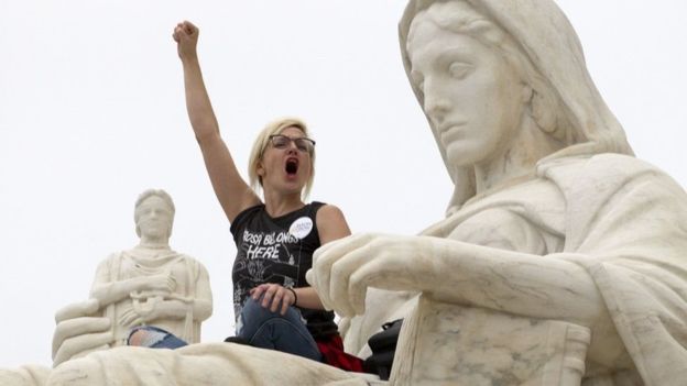 Người biểu tình ngồi trên bức tượng bên ngoài Tòa án Tối cao