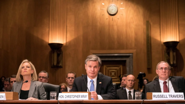 Từ trái qua phải: Bộ trưởng An ninh Nội địa Mỹ Kirstjen Nielsen, Giám đốc Cục Điều tra Liên bang Mỹ (FBI) Christopher Wray và Quyền Giám đốc Trung tâm Chống khủng bố Quốc gia Mỹ Russell Travers tại phiên điều trần ngày 10/10 (Ảnh: Reuters)
