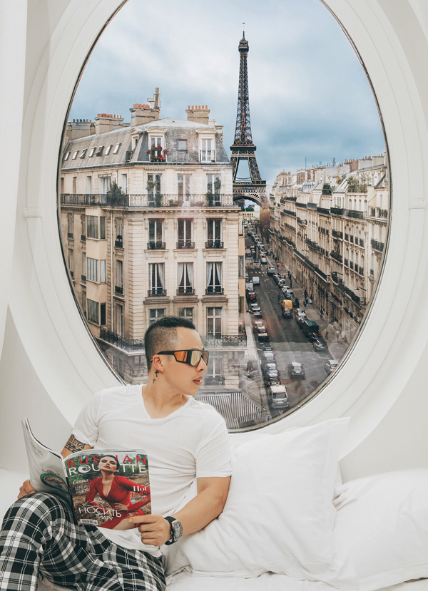 Ngọc Trinh đặt trước 2 tháng để được lưu trú trong căn phòng có view hướng thẳng ra tháp Eiffel. Giá thuê không hề rẻ, 25 triệu/đêm, nhưng nữ người mẫu thấy xứng đáng vì được ngắm góc đẹp nhất của Paris.